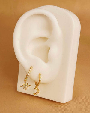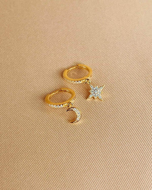 This sparkling pair will have you shining any time of day. With a mismatched moon and star charm dangling on classic huggies, this gorgeous pair is perfect for those who love the moon and stars.